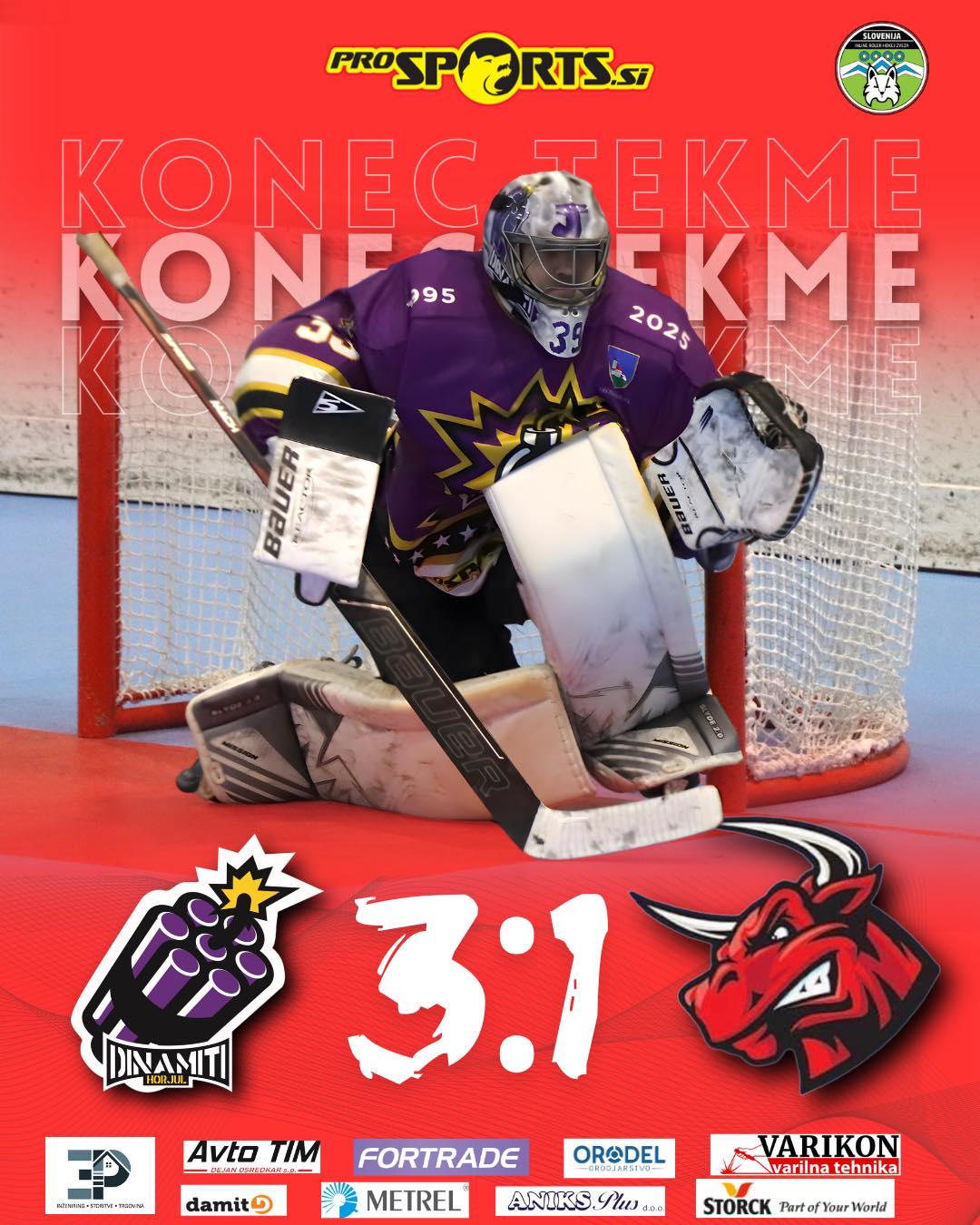 Hokejisti HK Dinamiti Horjul so leto zaključili na najlepši možen način. V derbiju proti močni ekipi HK Flying Bulls so slavili z rezultatom 3 : 1 in si z odlično predstavo zagotovili 1. mesto na lestvici ob vstopu v novo leto.